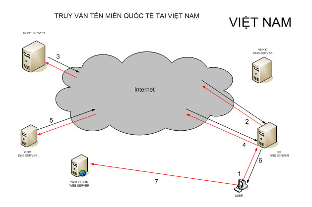 Quá trình truy vấn tên miền quốc tế (ví dụ www.yahoo.com) sẽ gồm các bước sau: