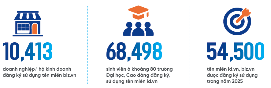Tính đến hết tháng 12/2025, tổng số tên miền quốc gia Việt Nam “.vn” đang hoạt động là 685,000 tên miền, tăng 8.6% so với cùng kỳ năm 2024, trong đó có 215,000 tên miền mới phát triển trong năm, tăng 23.7% so với cùng kỳ năm 2024, đạt mức tăng trưởng bình quân 4.89% trong giai đoạn 5 năm gần đây.